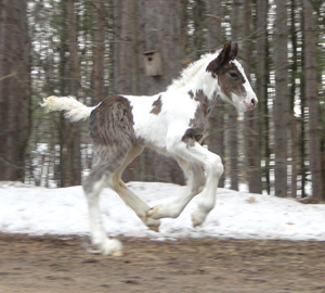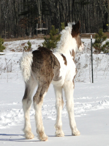 Feathered Gold Irish Rose Roxanne x Feathered Gold Moe GVHS Registered #GV02041F1 Filly Born 03/17/2011 Color DNA Test Results = Ee, Tt, aa ***Sold - Congratulations Hillary of Texas*** ***Click here for Video of Irish Rose*** Confidence, conformation, style, beauty, grace, charisma, hair, feather....these words don't even begin to describe Irish Rose. This girl is a looker who will turn heads everywhere she goes. This horse will get you noticed in the show ring, on the trail, on the farm, or where ever you may be. As an added bonus, she is sweet as can be, very laid back and willing to please. She is GVHS registered and DNA Color Tested Hetrozygous for the tobiano (Tt) gene and Hetrozygous for the black color gene (Ee). Priced at $10,000 until weaning.